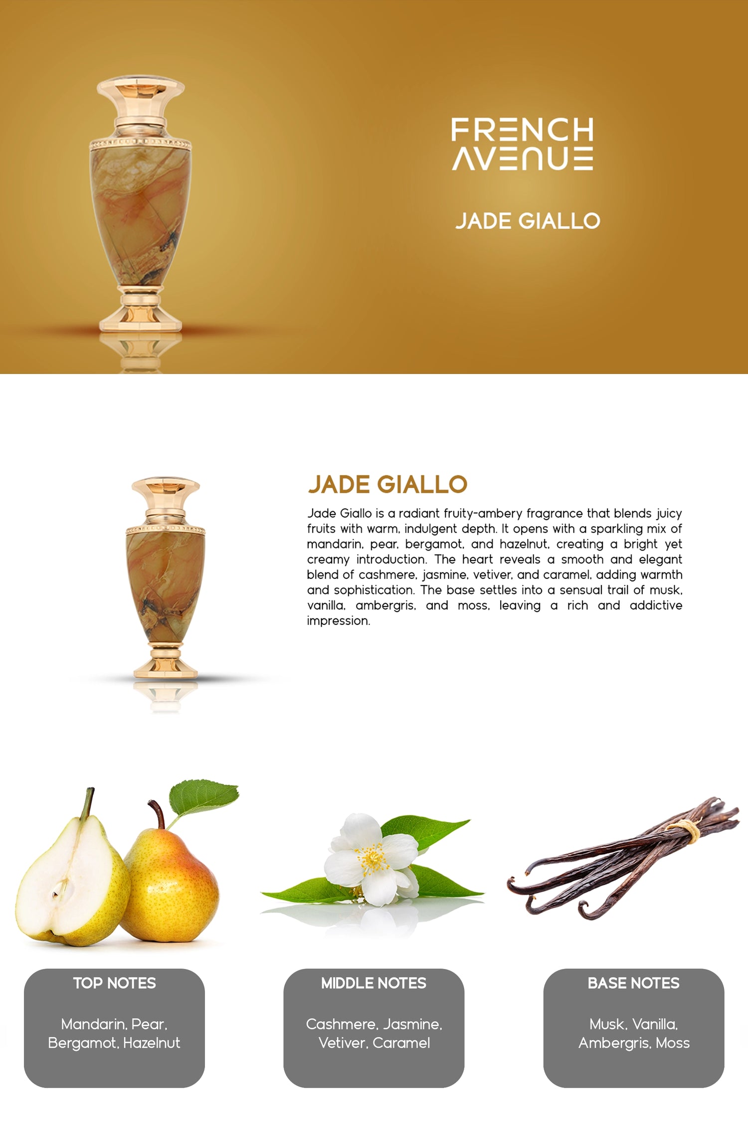 Jade Giallo is a radiant fruity-ambery fragrance that blends juicy fruits with warm, indulgent depth. It opens with a sparkling mix of mandarin, pear, bergamot, and hazelnut, creating a bright yet creamy introduction. The heart reveals a smooth and elegant blend of cashmere, jasmine, vetiver, and caramel, adding warmth and sophistication. The base settles into a sensual trail of musk, vanilla, ambergris, and moss, leaving a rich and addictive impression.