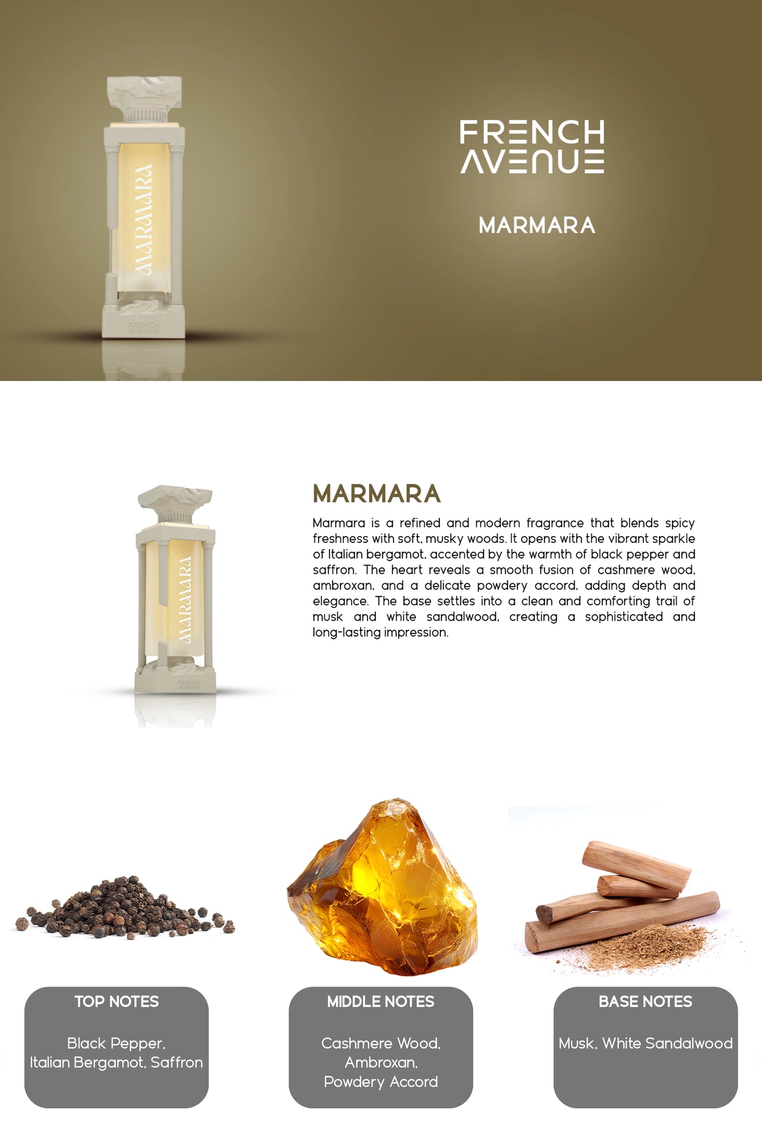 Marmara is a refined and modern fragrance that blends spicy freshness with soft, musky woods. It opens with the vibrant sparkle of Italian bergamot, accented by the warmth of black pepper and saffron. The heart reveals a smooth fusion of cashmere wood, ambroxan, and a delicate powdery accord, adding depth and elegance. The base settles into a clean and comforting trail of musk and white sandalwood, creating a sophisticated and long-lasting impression.
