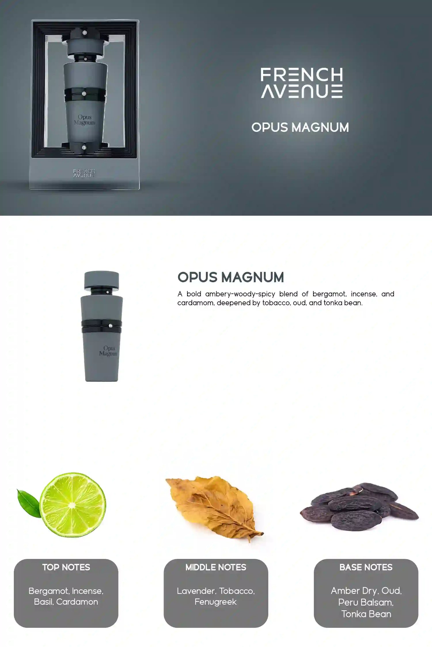 Envelop your senses in Opus Magnum, an exquisite amber - woody - spicy fragrance highlighted by captivating notes of cardamon, tobacco, oud. This strong intensity scent invites you into a personal moment of sophistication and elegance, evoking a sensory experience uniquely yours.