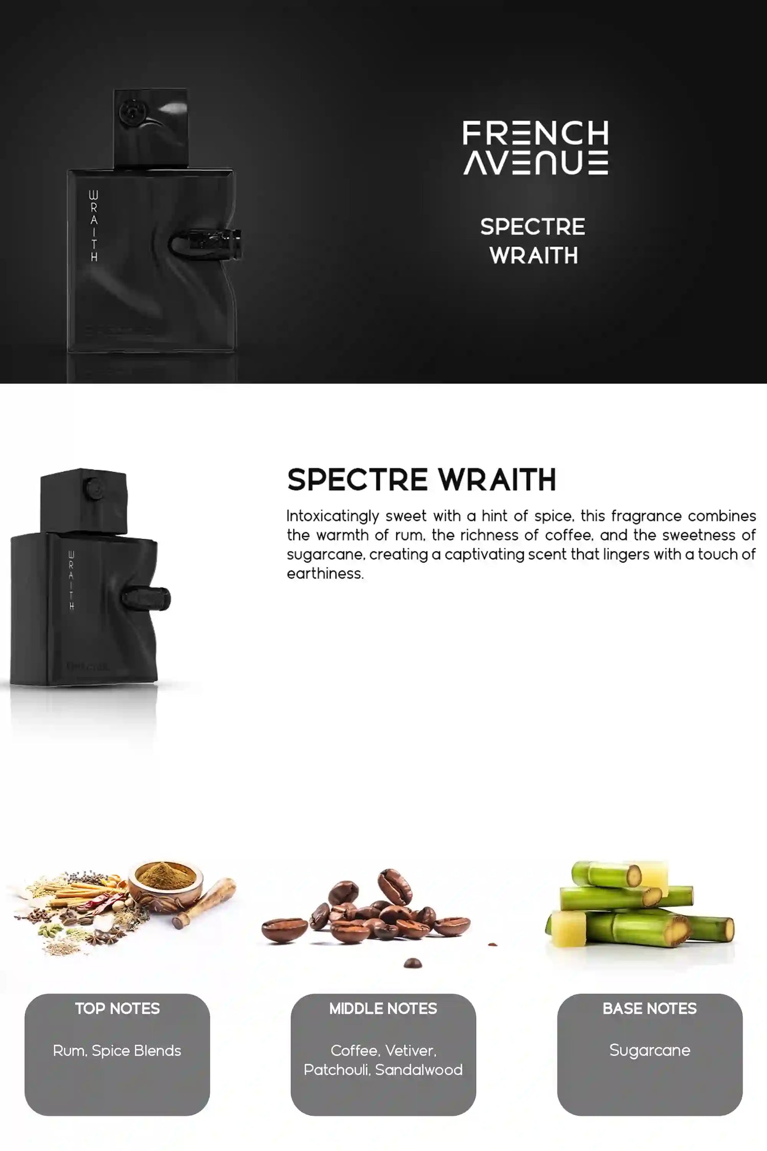 Inspired By 007 James Bond, Spectre Wraith Is Intoxicatingly Sweet With A Hint Of Spice. It Combines The Warmth Of Rum, The Richness Of Coffee, And The Sweetness Of Sugarcane, Creating A Captivating Scent That Lingers With A Touch Of Earthiness.