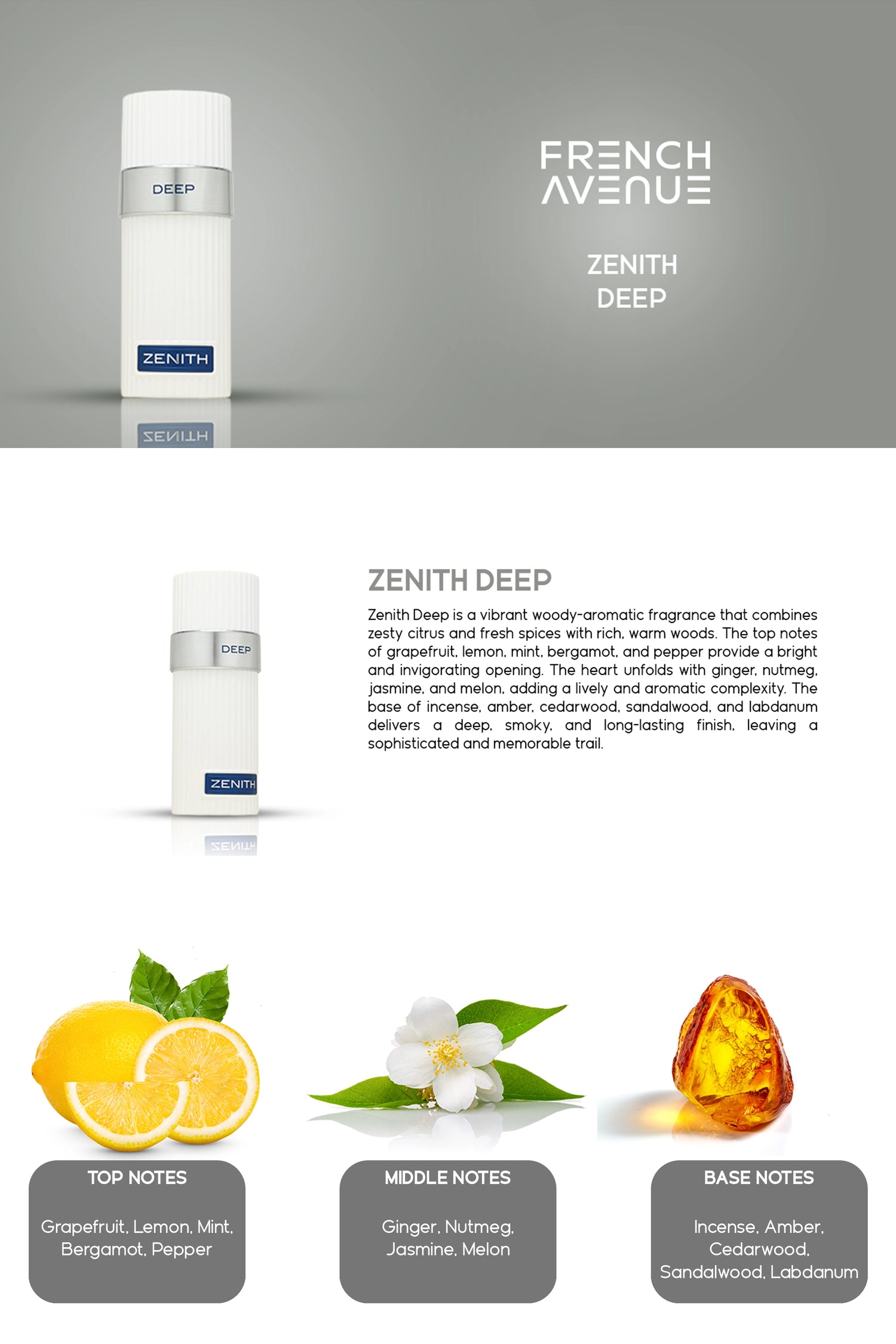 Zenith Deep is a vibrant woody-aromatic fragrance that combines zesty citrus and fresh spices with rich, warm woods. The top notes of grapefruit, lemon, mint, bergamot, and pepper provide a bright and invigorating opening. The heart unfolds with ginger, nutmeg, jasmine, and melon, adding a lively and aromatic complexity. The base of incense, amber, cedarwood, sandalwood, and labdanum delivers a deep, smoky, and long-lasting finish, leaving a sophisticated and memorable trail.