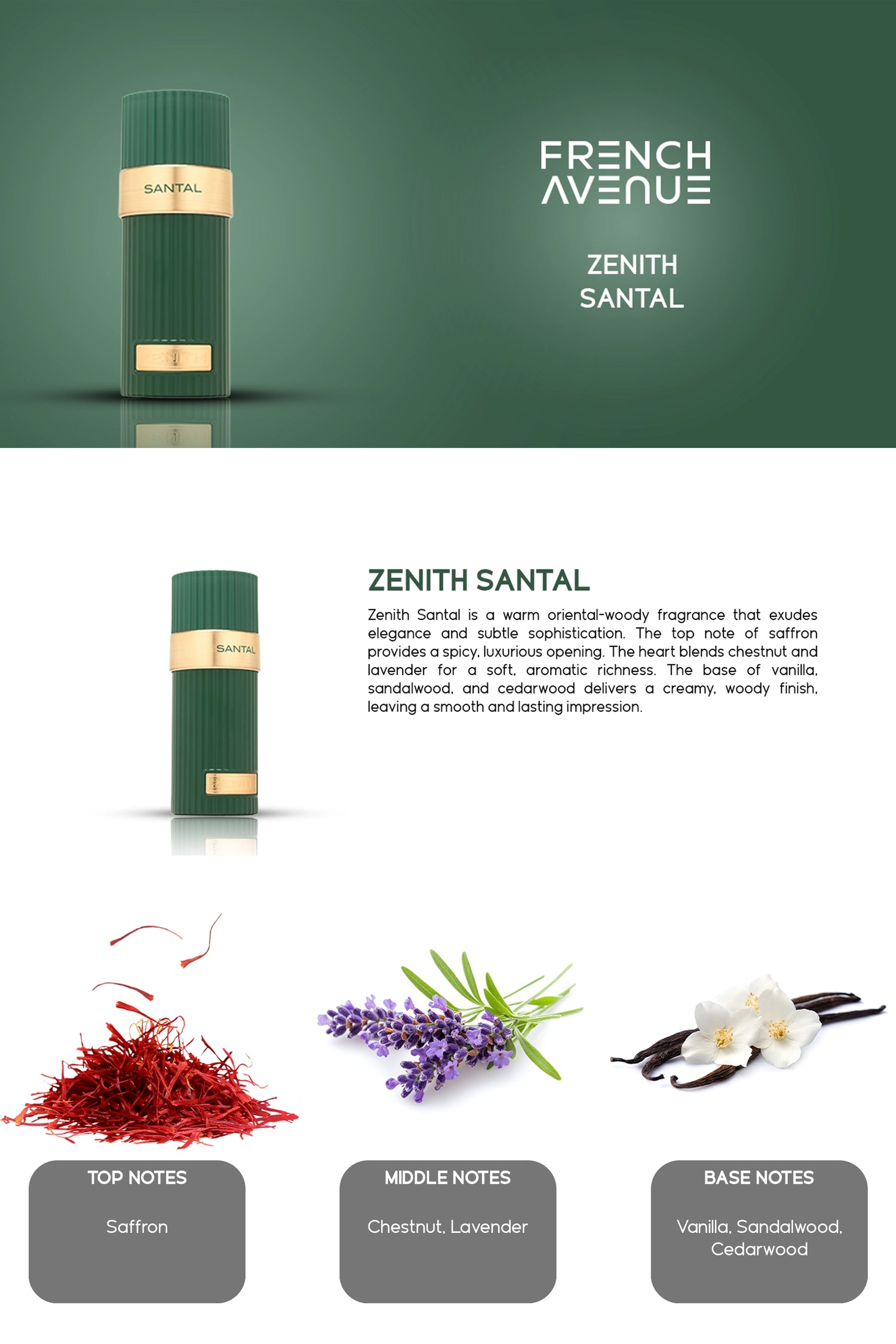 Zenith Santal is a warm oriental-woody fragrance that exudes elegance and subtle sophistication. The top note of saffron provides a spicy, luxurious opening. The heart blends chestnut and lavender for a soft, aromatic richness. The base of vanilla, sandalwood, and cedarwood delivers a creamy, woody finish, leaving a smooth and lasting impression.